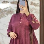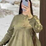 كسوة 2026 مخطّط (Corduroy look) كيعطي لوك شتوي أنيق. فيها أزرار فالصدر وزواق ذهبي فالكم،